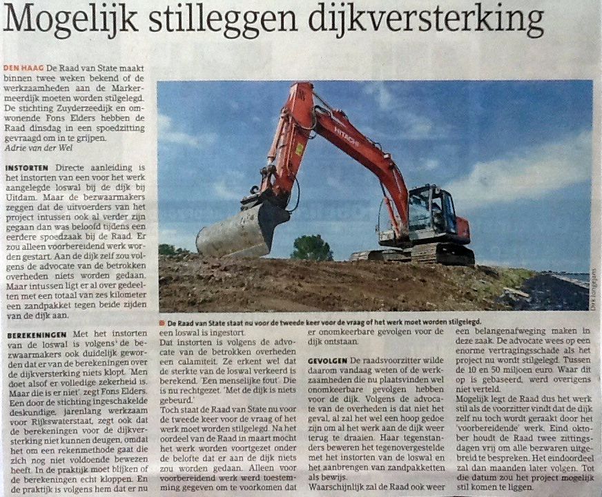 De Stichting Zuyderzeedijk en de IJsselmeervereniging hebben in juli tevergeefs een tweede voorlopige voorziening aangevraagd bij de Raad van State vanwege het instorten van de loswal bij Uitdam. Wij hebben steeds gewezen op de risico’s van storten van grote hoeveelheden zand en het bouwen van een dijk op slappe veengrond. De risico analyse is echter nog steeds bedrijfsgeheim, ondanks onze WOB aanvraag.