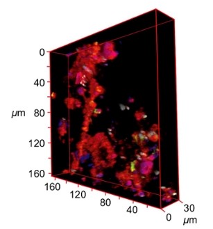 Doorsnede van een levende vlok bestaande uit slibdeeltjes, bacteriën en algen, welke aangetroffen is in de waterkolom van het Markermeer.