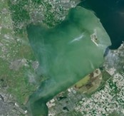 Satellietfoto van het Markermeer, waarop duidelijk te zien is hoe troebel het water is.