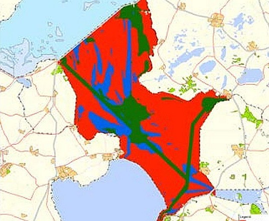 Rijkswaterstaat heeft samen met de provincies die het IJsselmeer omringen bekeken welke aktiviteiten dan wel of niet toelaatbaar zijn. Er is ook naar zandwinning gekeken, en daarvoor is speciaal een kaart gemaakt. De kleuren spreken voor zich. Rood: nee, tenzij.