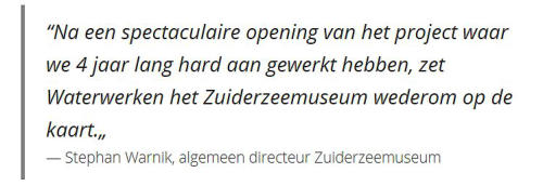 Donderdag 30 april is Waterwerken, een project van vier jaar, officieel geopend in het buitenmuseum van het Zuiderzeemuseum in Enkhuizen. Middels een spectaculaire openingsact op het water kregen genodigden en pers een exclusieve eerste indruk van het nieuwe waterdoepark. Tussen de herrezen Zuiderzee-eilanden zorgde musicalactrice Joke de Kruijf voor een muzikaal schouwspel.