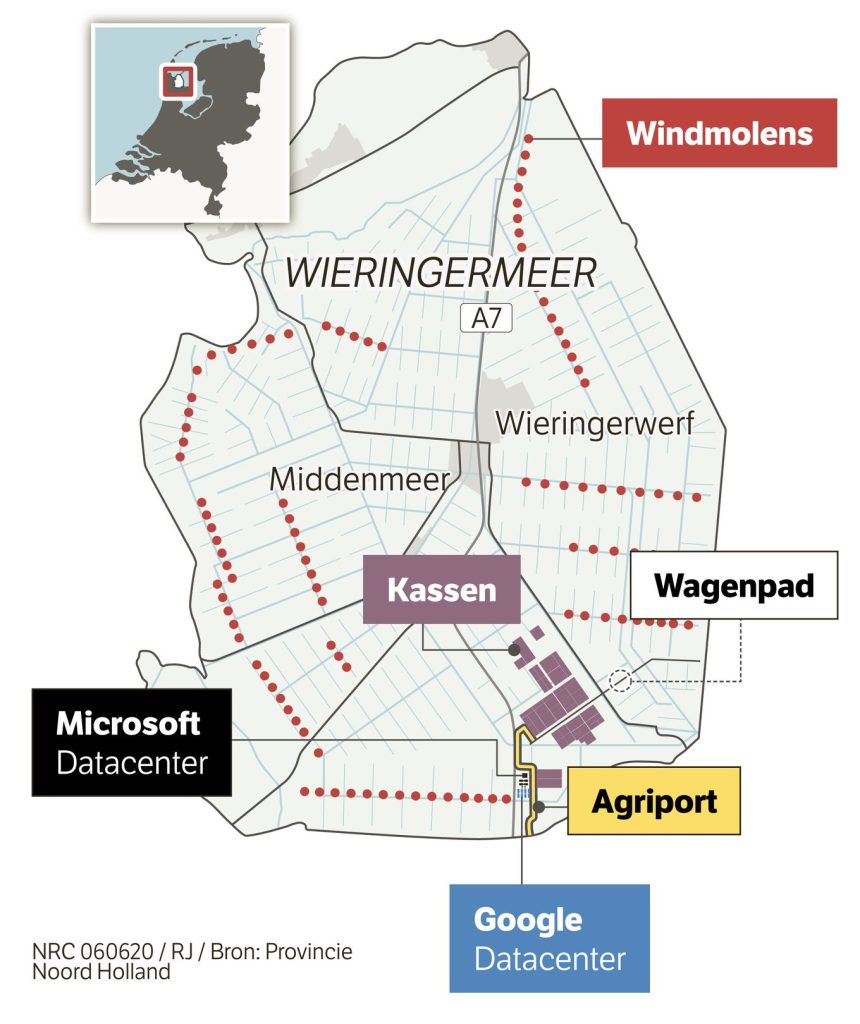 Dat merkte boer Han Lammers bijvoorbeeld. Hij wilde, vanwege de duurzaamheid, graag zonnepanelen op het dak van zijn nieuwe schuur in de Wieringermeerpolder. Kan niet, kreeg hij in een brief te horen van netbeheerder Liander. Het windpark, met het datacentrum als afnemer, belast het stroomnet zo zwaar, dat er voorlopig geen mogelijkheid is voor buurtbewoners zoals hij om zonnestroom te leveren.